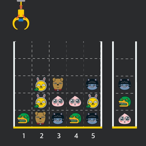 크레인 작동 시 인형이 집어지지 않는 경우는 없으나 만약 인형이 없는 곳에서 크레인을 작동시키는 경우에는 아무런 일도 일어나지 않습니다. 또한 바구니는 모든 인형이 들어갈 수 있을 만큼 충분히 크다고 가정합니다. (그림에서는 화면표시 제약으로 5칸만으로 표현하였음)