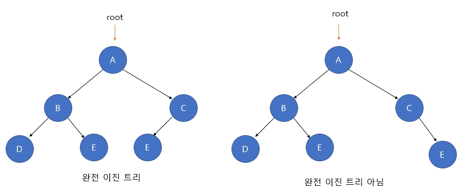 마지막 레벨을 제외하고 모든 레벨에 노드가 완전히 채워져 있는 이진 트리이다. 마지막 레벨에서는 노드가 꽉 차 있지 않아도 되지만 노드가 왼쪽에서 오른쪽으로 채워져야 한다.