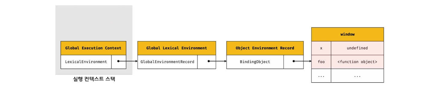 foo 함수 정의는 전역 코드 평가 시점에 평가된다. 즉, foo 함수의 상위 스코프는 전역 스코프이다. 때문에 외부 렉시컬 환경에 대한 참조에 전역 렉시켤 환경의 참조가 할당된다.